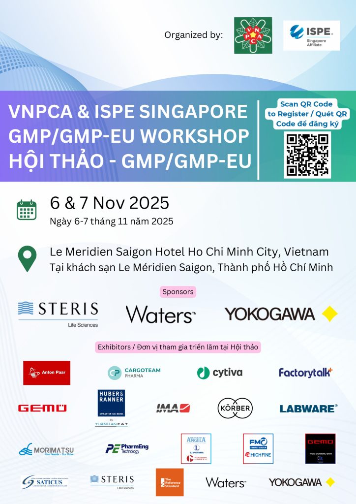 Được sự phối hợp và hỗ trợ một phần kinh phí từ Hiệp hội kỹ thuật Dược phẩm quốc tế chi nhánh Singapore (ISPE Singapore). Hiệp hội Doanh nghiệp Dược Việt Nam kính mời các Doanh nghiệp tham dự Hội thảo GMP/GMP-EU và tương đương năm 2025 và Triển lãm bên lề Hội thảo cụ thể như sau: